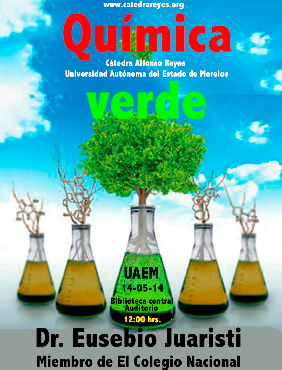La Cátedra Alfonso Reyes de la Universidad Autónoma del Estado de Morelos invita a la conferencia Química verde y organocatálisis: dos temas relevantes de la química en el siglo XXI; conferencia que será impartida por el Dr. Eusebio Juaristi, (miembro de El Colegio Nacional, Profesor Emérito e Investigador en el Departamento de Química del CINVESTAV-IPN), el próximo 14 de mayo de 2014 a las 12:00 horas en el Auditorio de la Biblioteca Central, Campus Chamilpa.