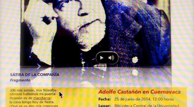 Adolfo Castañón, extraordinario poeta mexicano y distinguido Miembro de la Academia Mexicana de la Lengua, estará el próximo 25 de junio a las 12:00 horas en Cuernavaca. Lugar de reunión: Biblioteca Central de la Universidad Autónoma del Estado de Morelos, U.A.E.M, Campus Chamilpa, Morelos, México. Entrada libre. Todos lo(a)s poetas del mundo están cordialmente invitados.