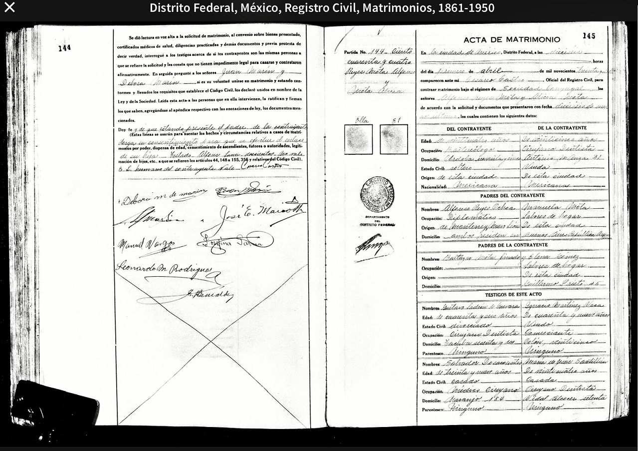 Acta de matrimonio entre Alfonso Reyes Mota y Alicia Mota (1 de abril de 1937, Ciudad de México, México).