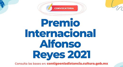 La Secretaría de Cultura, a través del Instituto Nacional de Bellas Artes y Literatura (INBAL), por medio de la Coordinación Nacional de Literatura, la Universidad Autónoma de Nuevo León y la Sociedad Alfonsina Internacional convocan al Premio Internacional Alfonso Reyes 2021.