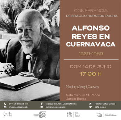 14 de julio: Conferencia magistral de Braulio Hornedo Rocha: Alfonso Reyes en Cuernavaca (1939-1959). Modera: Ángel Cuevas. Domingo 14 de julio de 2019, 17:00 horas.