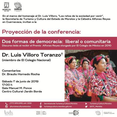1 de junio: Proyección de la conferencia del Dr. Luis Villoro Toranzo (miembro de El Colegio Nacional): Dos formas de democracia: liberal o comunitaria. Discurso leído al recibir el Premio Alfonso Reyes otorgado por El Colegio de México en 2010. Presentación y comentarios: Braulio Hornedo Rocha. Sábado 1 de junio de 2019, 17:00 horas.